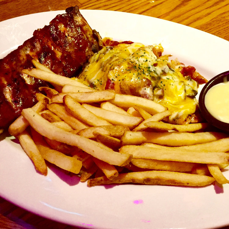 【アメリカダイニング🌺】大阪アウトバックステーキの✳︎スペアリブとアリススプリングチキンの セット\(^o^)/✳︎ スペアリブは濃いめの味付けが最高〜♫、鶏肉は べーコン、マッシュルーム、チーズをトッピングしたアウトバックの定番メニューo(^▽^)o ハニーマスタードソースが絶妙に甘くて美味しいー!! たまに無性に行きたくなるお店です🌺🌺 食べ放題でついてくるパンも実は絶品です✳︎ ♯大阪