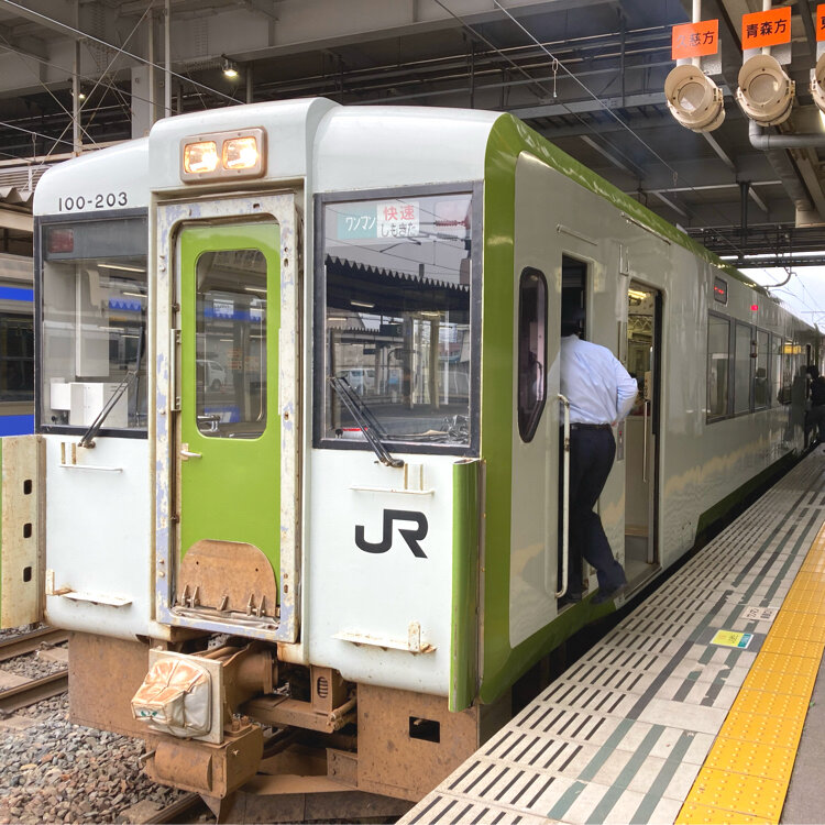 これから乗る電車は、はまなすベイライン大湊線接続の快速しもきた🚃💨💨これに乗れば乗り換え無しで約1時間半で恐山に行くバスが出る下北駅まで行けるので、いっぱい人が乗り込んで来ました‼️そして、本物の鉄ちゃん達がバシバシ写真を撮っていたので、私も釣られて撮ってみました~🤣