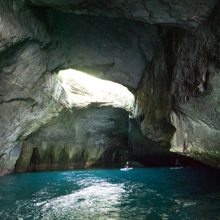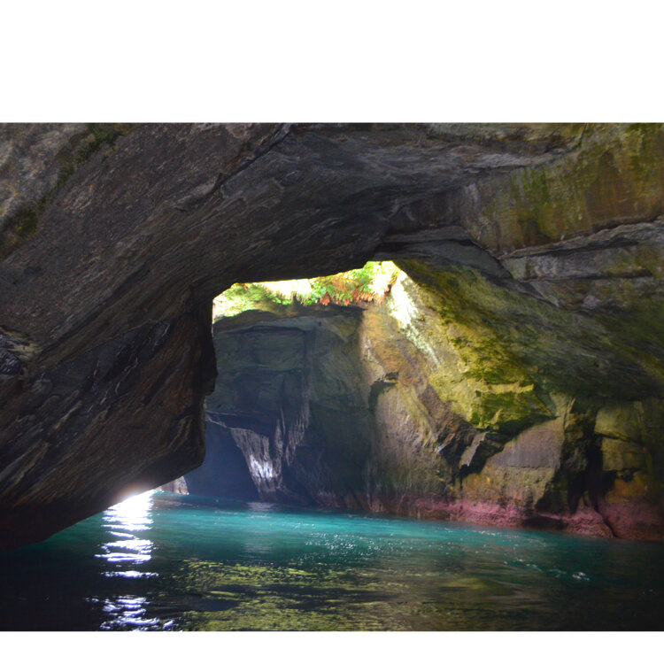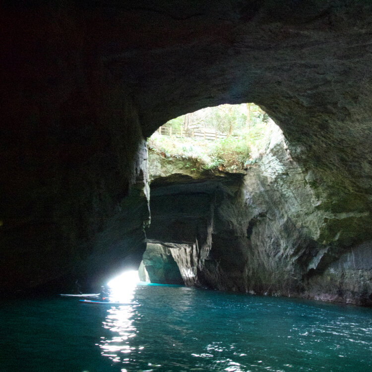 柔らかい凝灰岩でできた岩を波が浸食して洞窟になったそうです