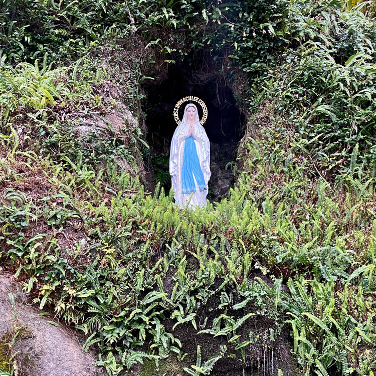 敷地内には聖地ルルドがあり、慈愛の微笑みをたたえたマリア様が祀られています。