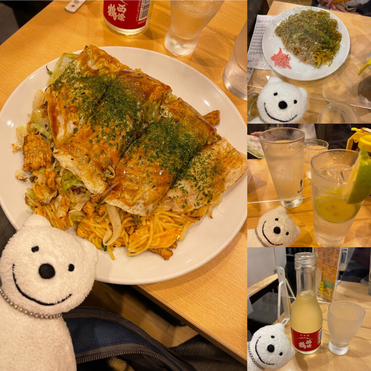 クマ散歩:麗ちゃんで品行方正なクマは、お好み焼きイカ天、焼きそば、レモンサワー、広島生レモンスライスサワー&西條鶴の広島の夕べ The Bear had a drink with Okonomiyaki with Fried Squid, Yakisoba, Lemon Sour, Hiroshima Lemon Sour with Fresh Sliced Lemon & Saijotsuru Sake at Reichan, ekie, Hiroshima!♪☆(*^o^*)