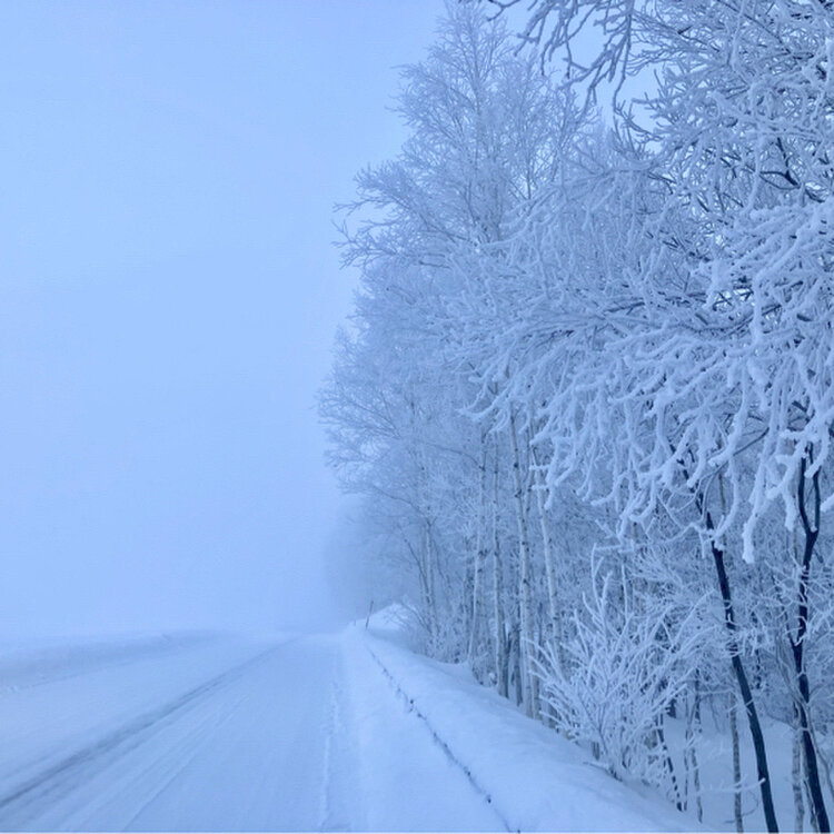 辿り着く手前の道路沿いの霧氷が美しくて…