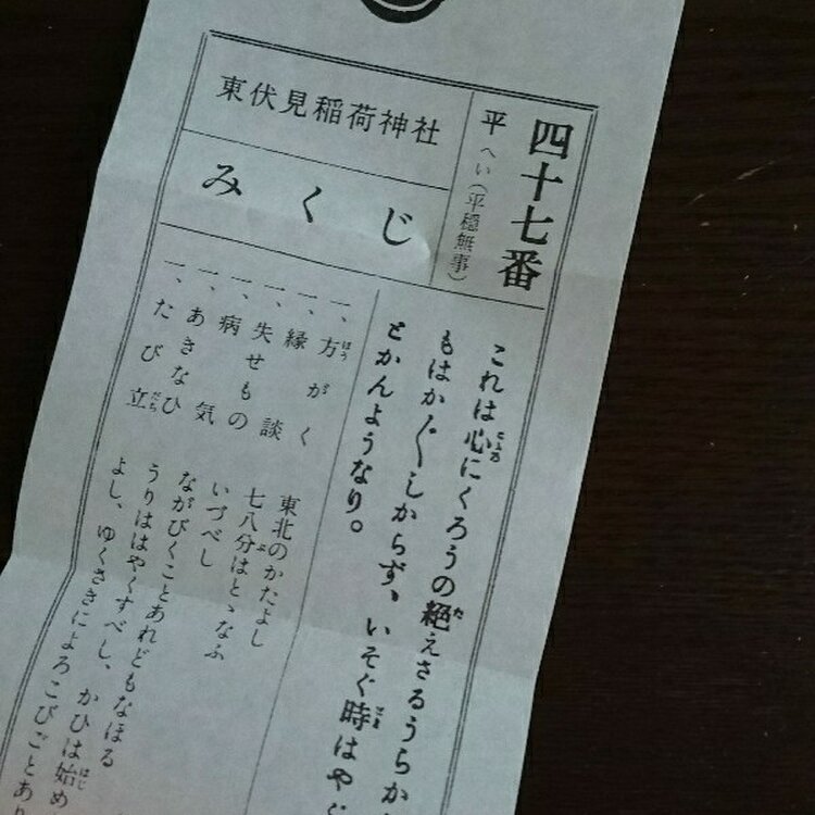 暮れに東伏見稲荷神社に行きました。 お正月はすごく混むので。。 おみくじは「平」 初めて見ました。 東伏見稲荷神社は、ほかにもちょっと変わったおみくじがあるようです。