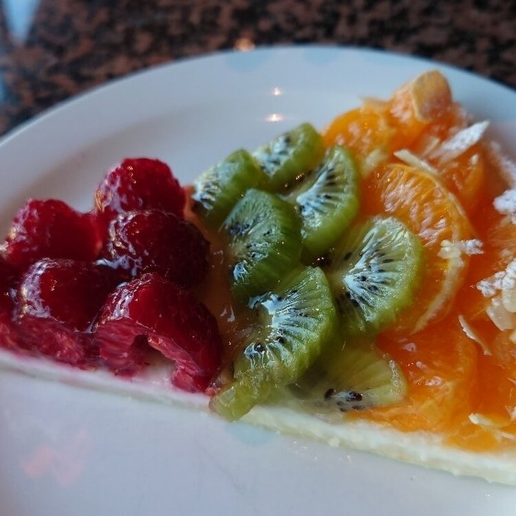こんばんは🌙 フルーツたっぷりのケーキ美味しそうですね💕 デザートセットで750円 日本と変わらないくらいですね😊 ヨーロッパは今物価高いんですか アメリカでは外食できないようですが🍴