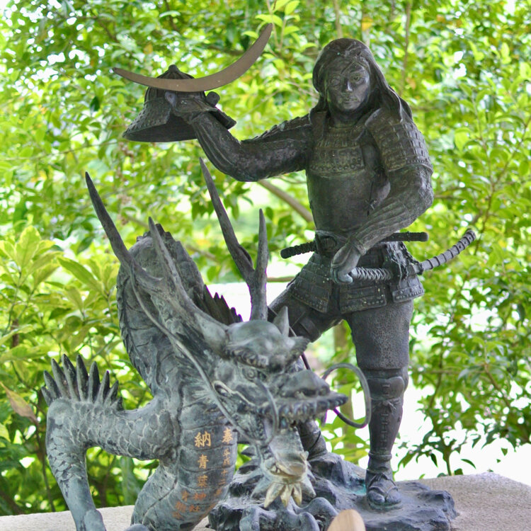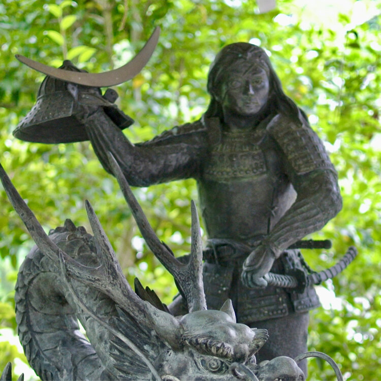 甲冑姿で🌙兜を脱いだ珍しい像が鎮座しています。