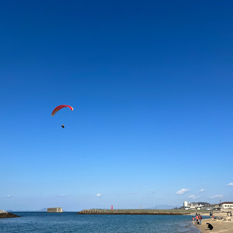 東京への帰り道に寄り道☻ ビーチに出たら、パラグライダーが飛んでました。 海水浴場ともあって、ちゃんとシャワーと更衣室もあるし、お土産も狭いけど種類は多いかも。