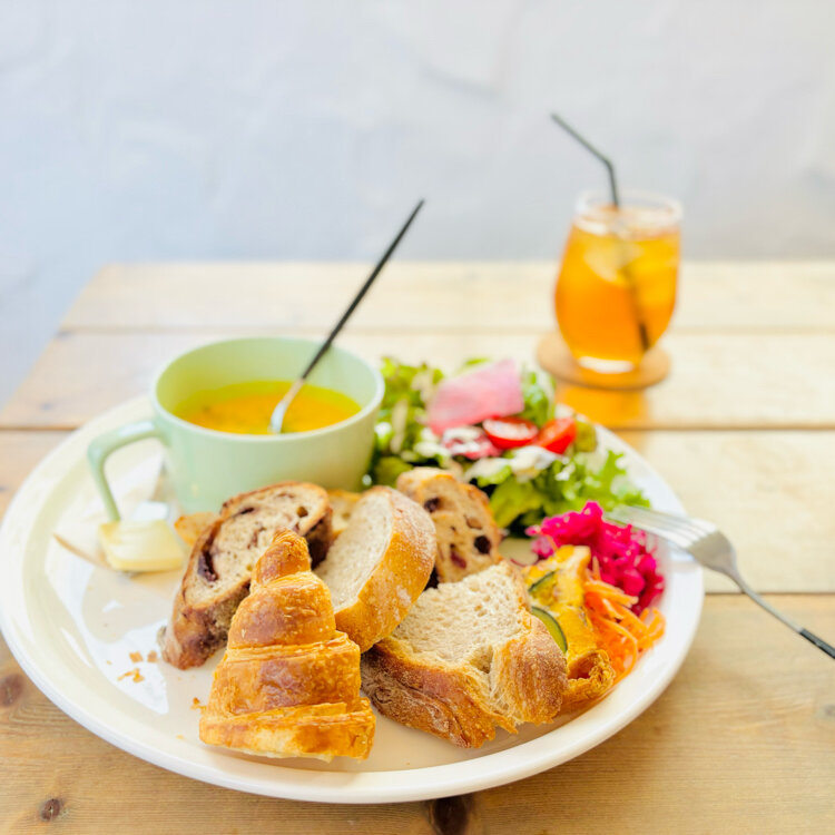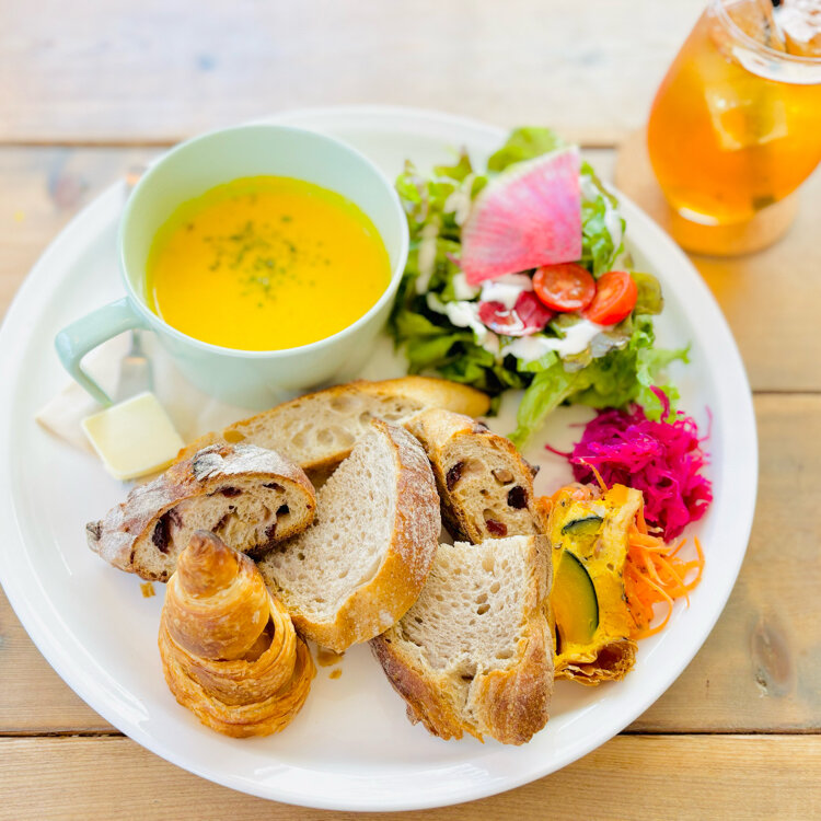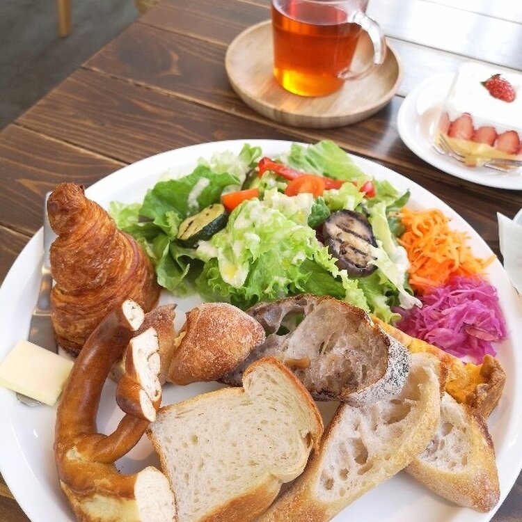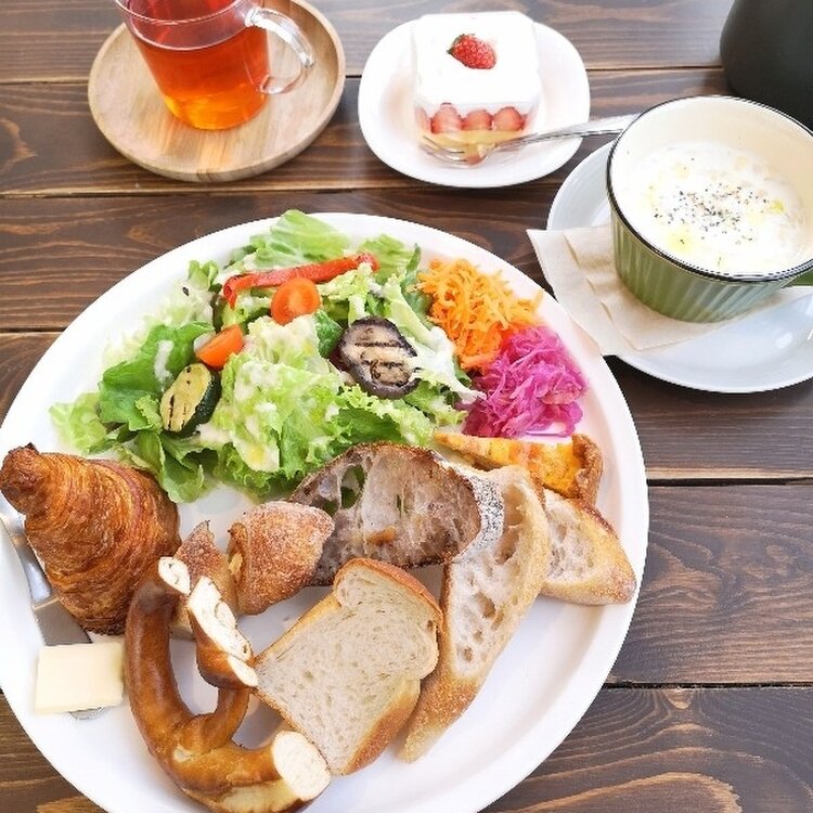 たっぷりのお野菜🥗🍅🍆🥑🥔🥕🥦と盛り沢山の焼きたてパン🍞🥐🥖🥯がワンプレートに✨