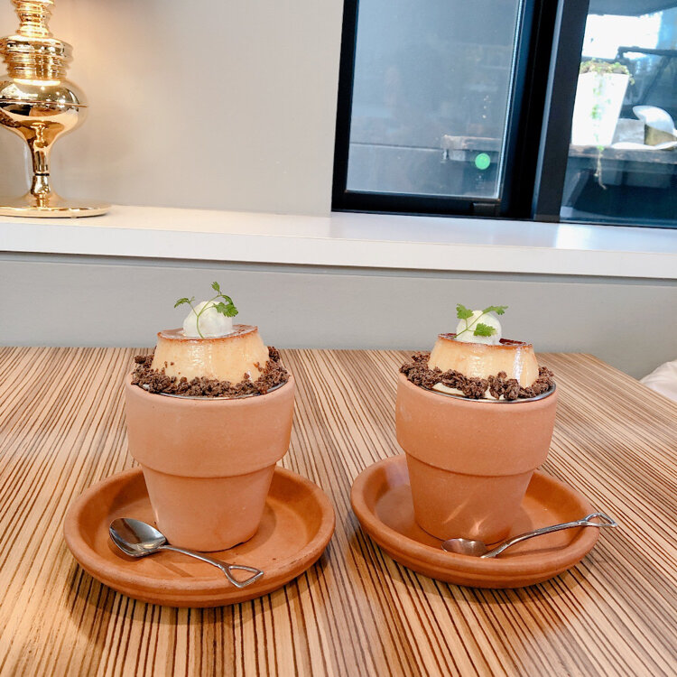 テラコッタの植木鉢に入ったプリンパフェは