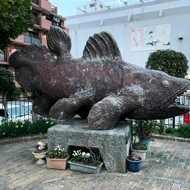 月島に向かう前に フラッと散歩していたら… シーラカンス⁉︎ 調べてみたら 『幸福の魚 GOMBESSA』ゴンベサと読む モニュメントだそう。 不思議…。