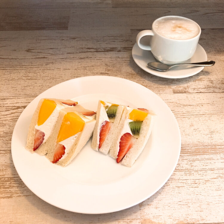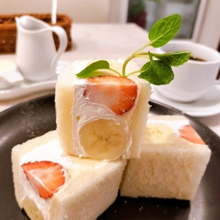 めちゃくちゃ綺麗なダイス🎲な萌え断フルサン、苺の甘酸っぱさとバナナの甘さにさっぱりしたホイップのおかげでこの量をぺろり😋🍴✨