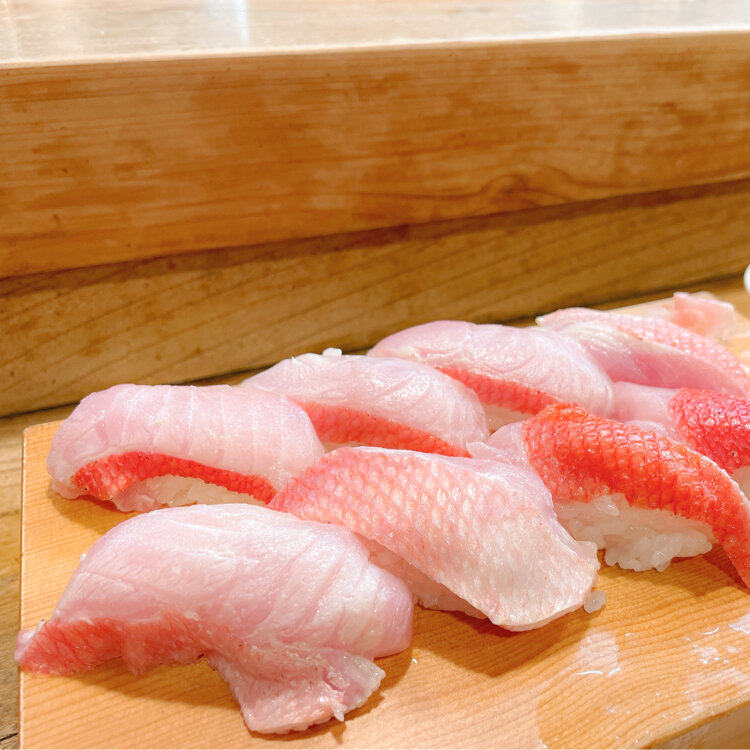 軽く炙った稲取キンメの握りは、
