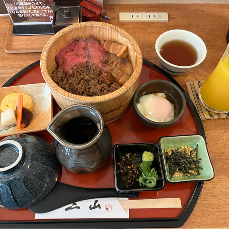 一つのお櫃にローストビーフ、豚の角煮、牛しぐれが乗っています😍