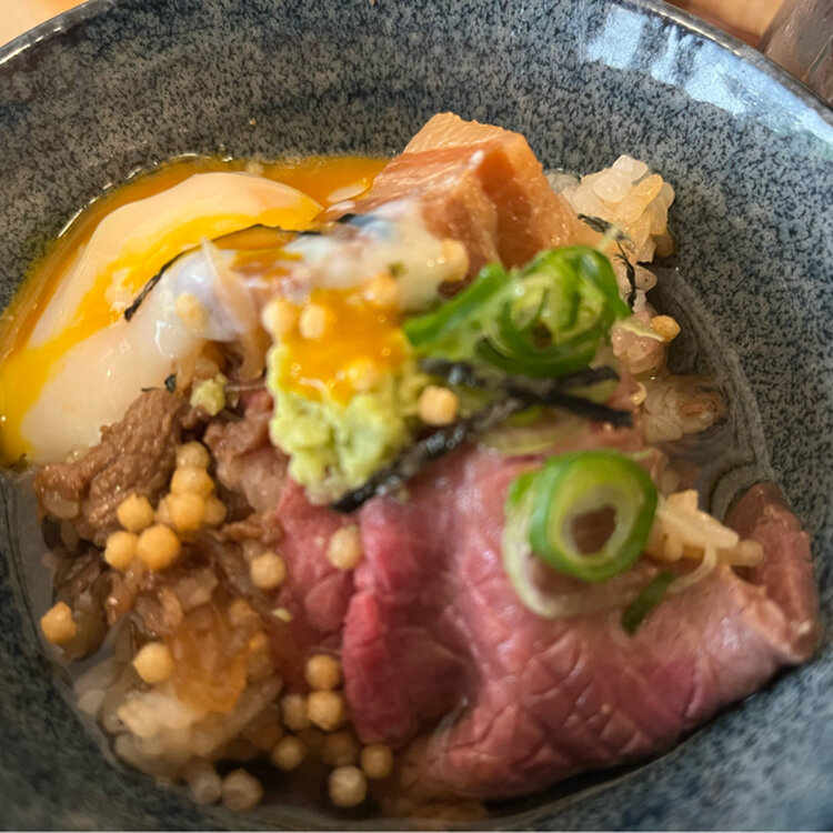 最後はお肉それぞれ全部乗せて、温泉卵も乗せて、温かいお出汁をかけると、はい最&高\( ˆoˆ )/