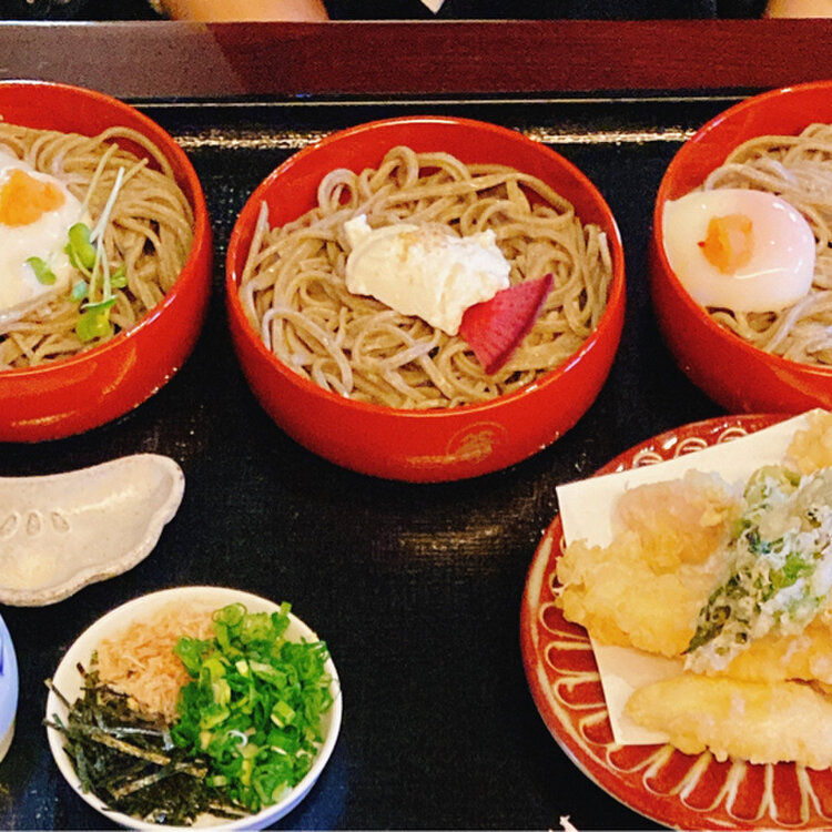 1.5人前とボリューミーですがとろろや天ぷら、温泉卵、おぼろ豆腐など飽きることなくペロリといただき2200円。もう一つの写真は3色+天ぷら付きです。
