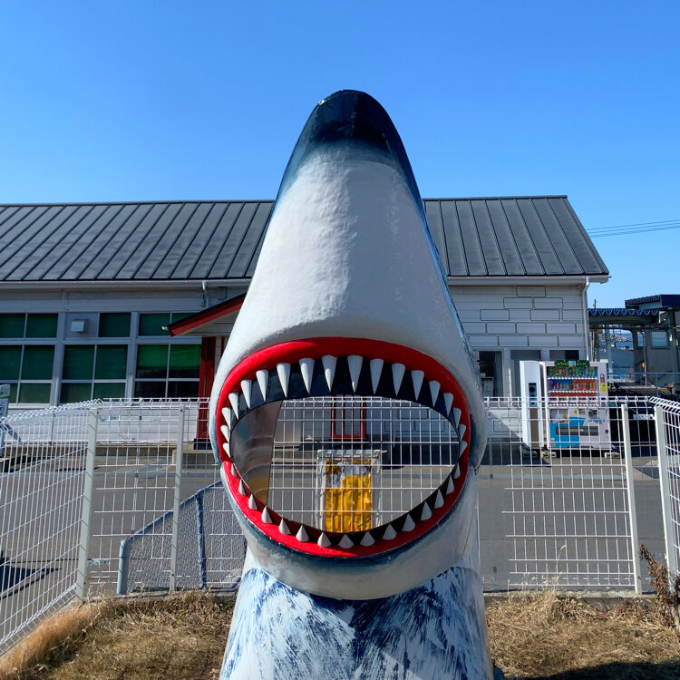 降り立つとこのオブジェに出迎えられ、鮫駅であることを実感します。