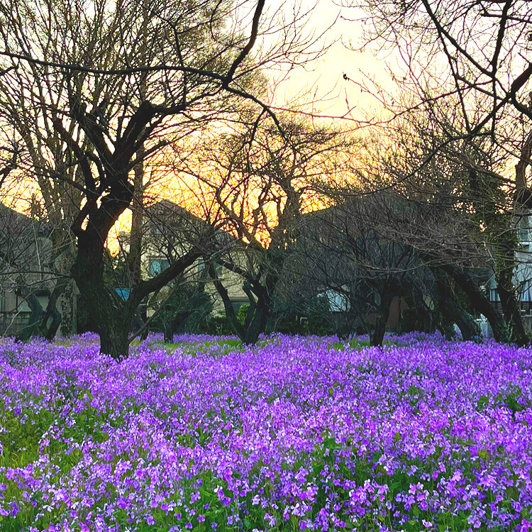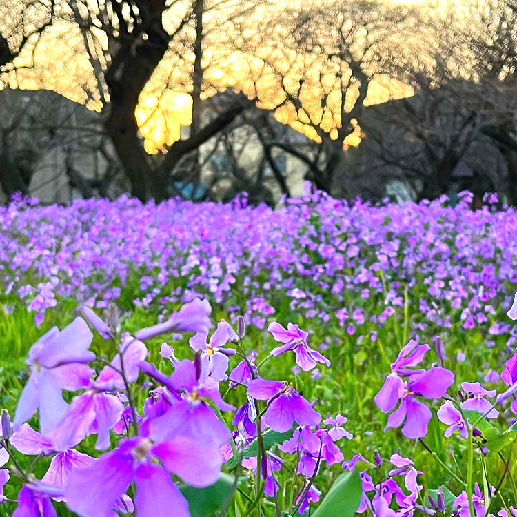 一面に広がる 紫色の絨毯♡ わたしの街の ショカッサイ(ムラサキハナナ)の群生地✨ 毎年今頃になると、ここで見られる風景です。 ナチュラルで 優しい雰囲気が素敵な 野の花。。 ソメイヨシノも 開花して、本格的に春が訪れた わたしの街です。