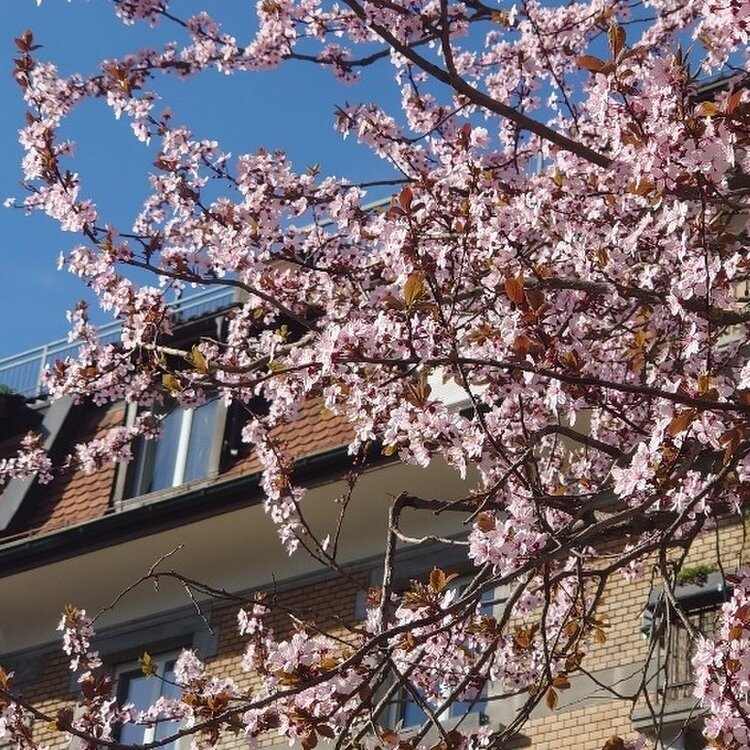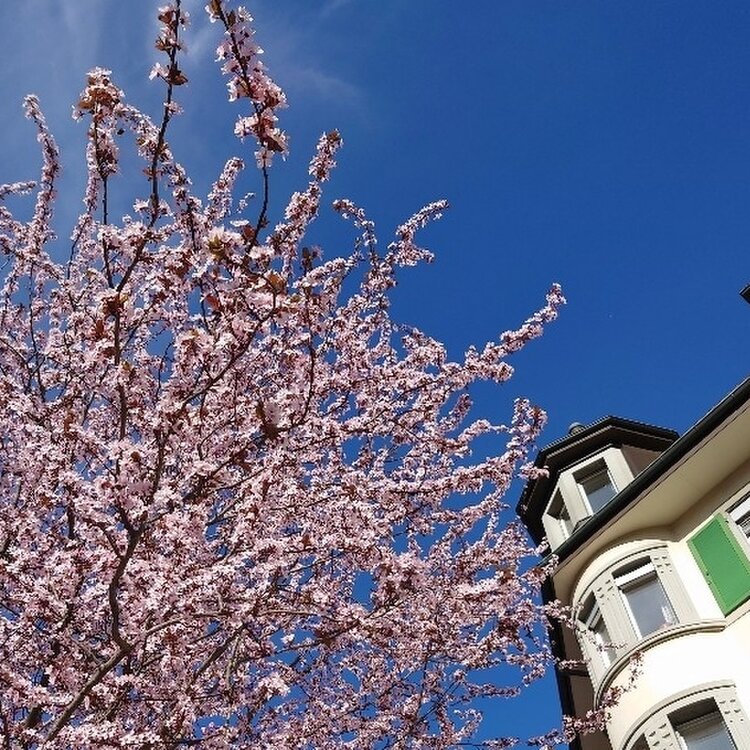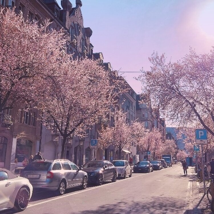 チューリッヒ、ベルタ通り。桜の木が満開を迎えています。青空に薄ピンクの花びらがとっても美しい。春のお花見を楽しみたいなら、ベルタ通りに行ってみよう。