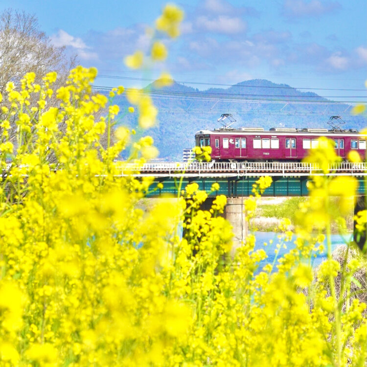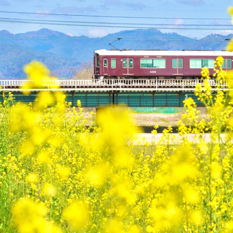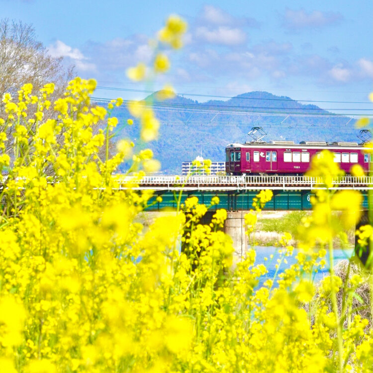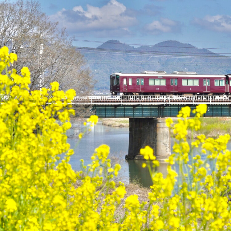 マルーンの疾風(かぜ)と呼ばれる阪急電車と黄色いからし菜の中を走る姿が可愛かったです😊🚃🎶