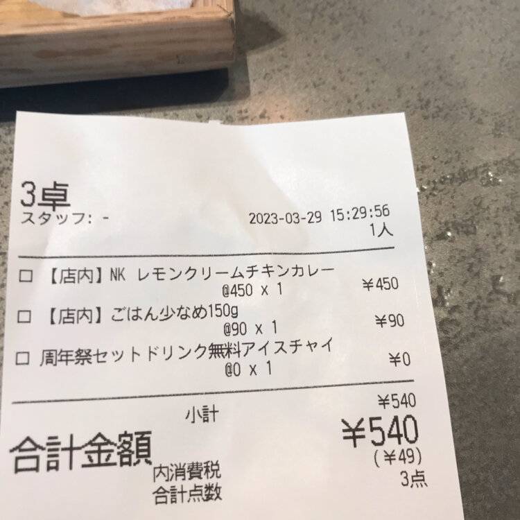 甘口でスパイシーでレモン🍋が香る、ごろっとチキンもけっこう入っていて、辛口が苦手な私は美味しかったです。無料でチャイも付いてワンコイン!とてもリーズナブルで美味しかったです。