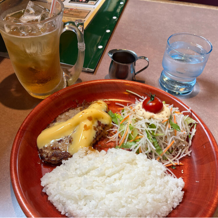 ランチはびっくりドンキーでチーズバーグディッシュ、もちろんハンバーグソースをもらってたっぷりかけて食べました☺️