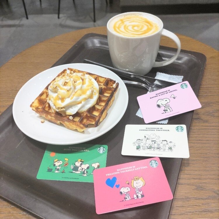 #スタバ #スターバックス #カプチーノ #アメリカンワッフル #ワッフル #スヌーピーコラボ #キャラメル #甘い #モーニング #スヌーピーが好き #スヌーピー並べてみた #スタバカード集めてます #Myことりっぷ #職場の仲良しスタッフから #ラインギフトもらった #ドリンクチケット #ありがとう