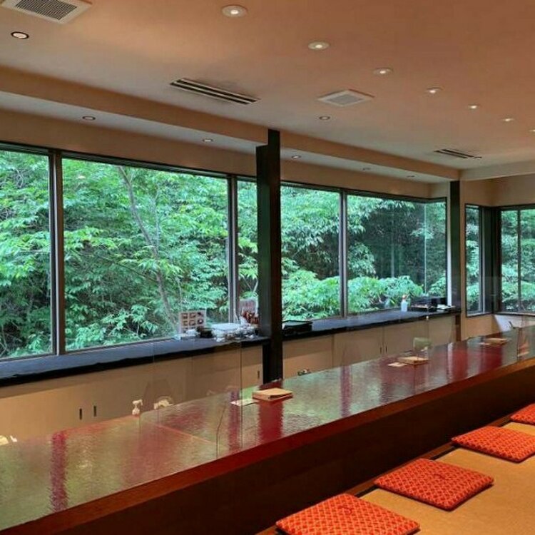 青々とした紅葉がワイドな窓いっぱいに広がる絶景ランチスポットです。