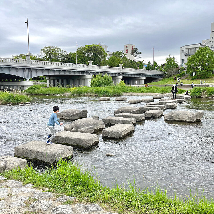 鴨川と高野川が合流する場所で、上空から見るとデルタ(Δ)になっています。亀などの大きな飛び石があり、青春ドラマ気分で石を飛び越えてみましたが、思ったより石と石の間隔が広い💦