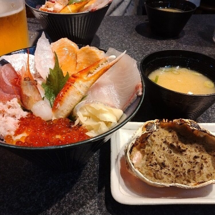 日本海さかな街 日本海側最大級の海鮮市場です 蟹、魚介系、海産物の活気あるお店がずらりと並び ランチにピッタリの海鮮丼や カニづくしの飲食街が並んでいます 若狭亭で かにの味わい丼、かに味噌甲羅焼きを頂きました わさび醤油をかけてパクパク食べました😋😋 #私のことりっぷ旅 #日本海さかな街