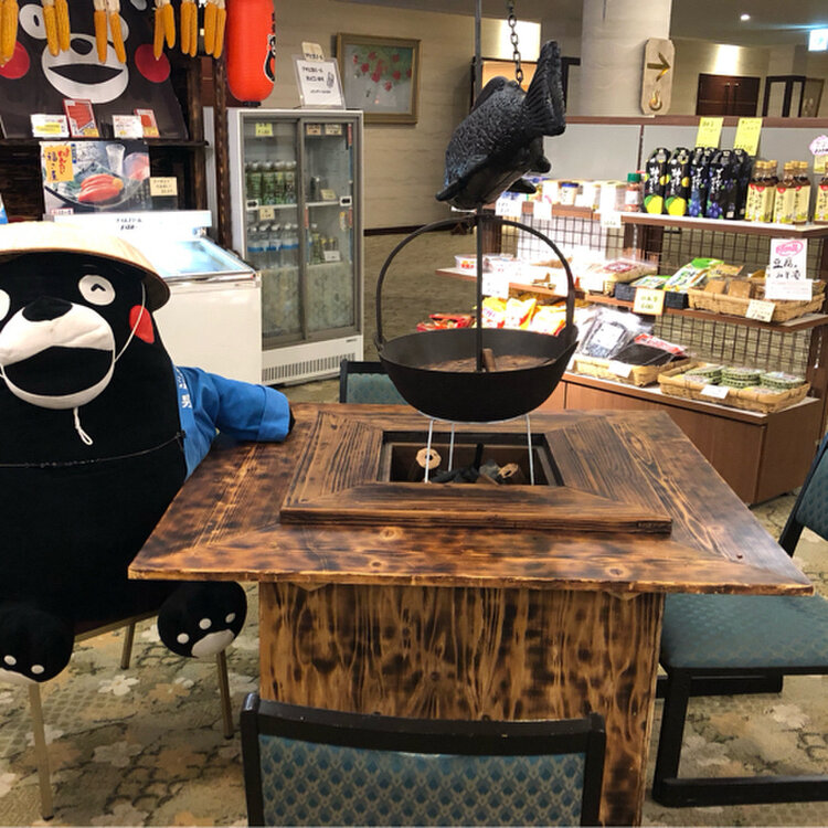 お土産売り場の囲炉裏にもおっきな子が!一緒に囲炉裏を囲んでるような記念撮影ができてステキでした。この子以外にも2体のおっきい子がいました。お手拭きの袋とかにもくまモンがいて、くまモン探しするのも楽しかったです(о´∀`о)