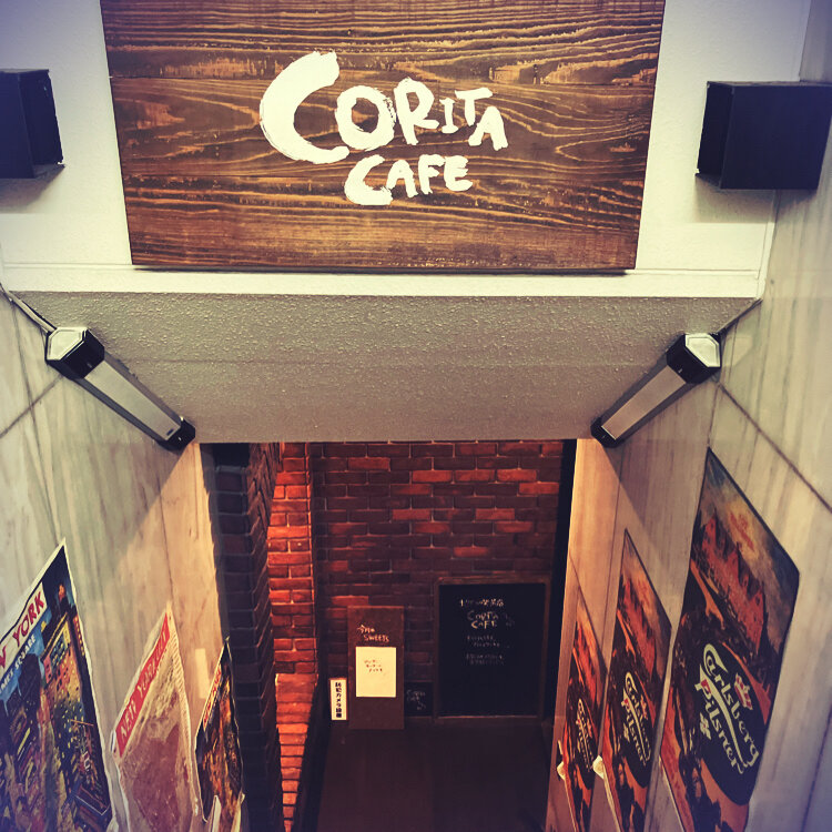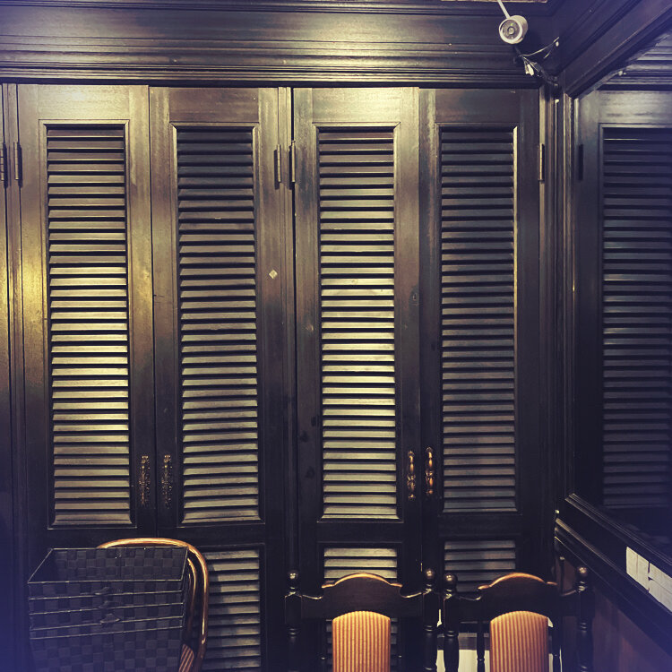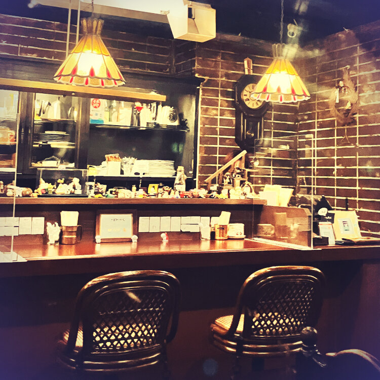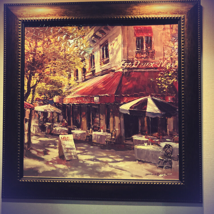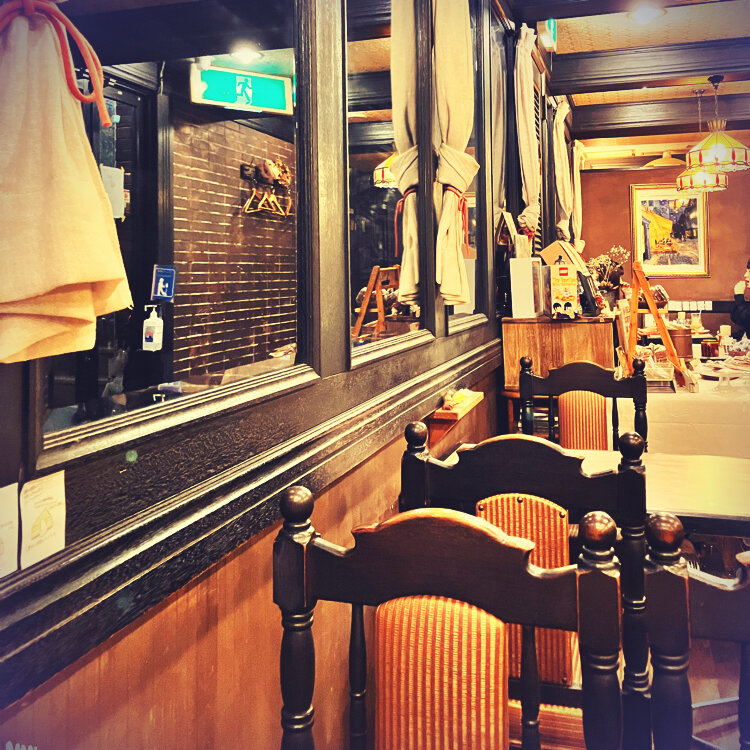 レトロな絵画が飾ってあるレンガ調の入り口に