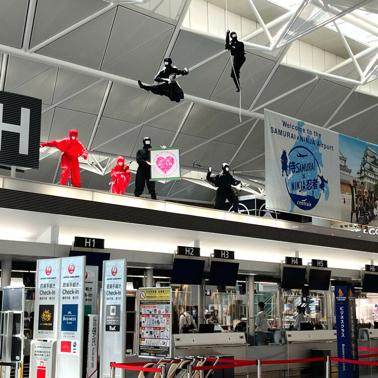 空港の入り口の屋根の上には忍者が...