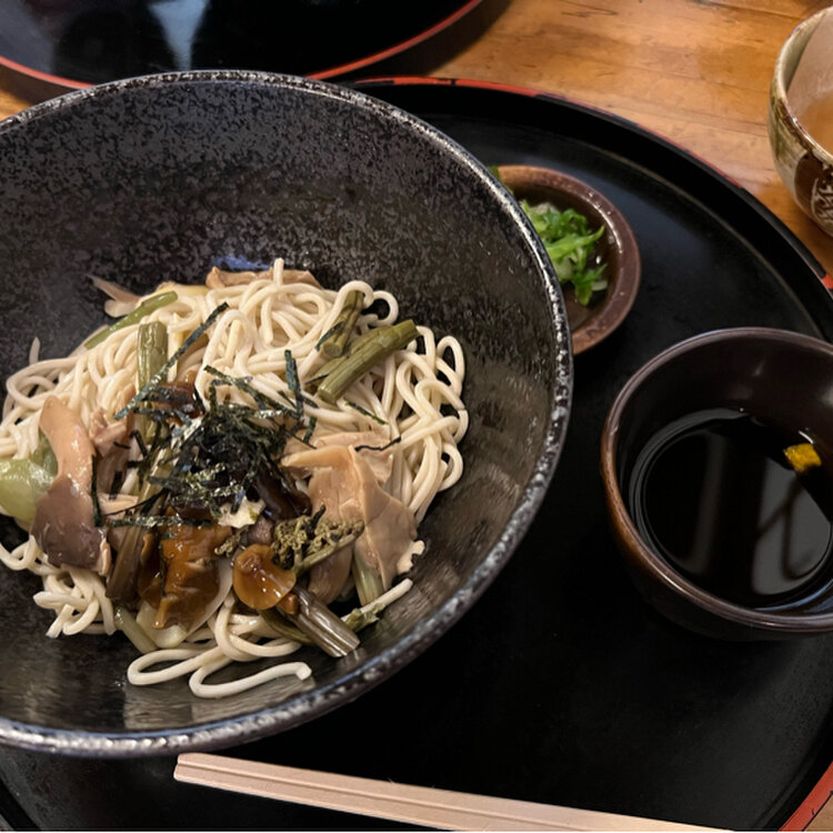 運ばれてきた冷やし山菜そばは、蕎麦の入った器とつゆの入った器が別々でしたが、お店の方は、つけ麺のようにして食べても、ぶっかけのようにして食べても、お好きなようにしてくださいと言ってましたので、私はぶっかけ風にしていただきました。