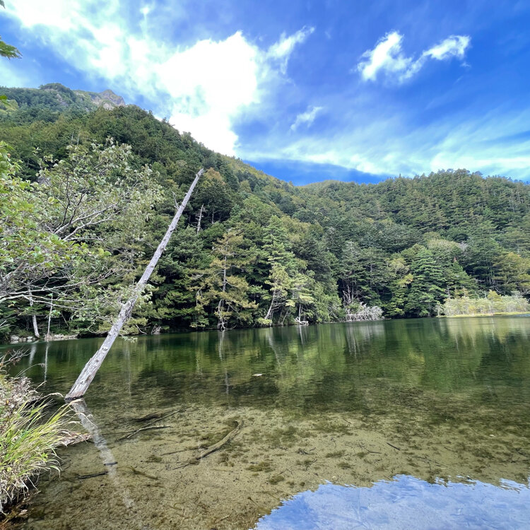 食べ進めているうちにお腹が満たされ、当初のがっつきも落ち着いて、ようやく大正池をゆっくり眺める余裕ができたのだが、エメラルドグリーンと濃淡のあるブルー、黄色、白といろいろな色味が見られる。遠くに見える焼岳や穂高連峰が美しく、特に山頂に残った白い雪と濃いグレーの山肌のコントラストこそが北アルプスの醍醐味だ。