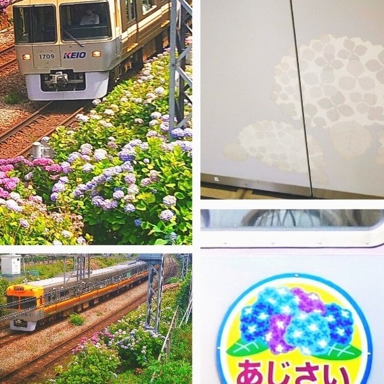 紫陽花が線路の両脇に花開く井の頭線沿線💜💙❤💚