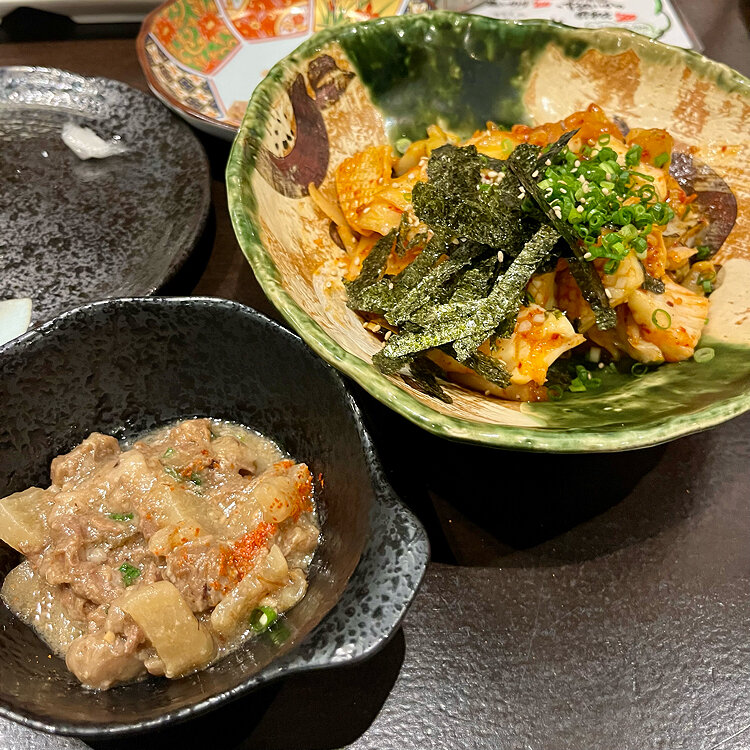 つきだしにはナスの味噌炒めときゅうりの和え物