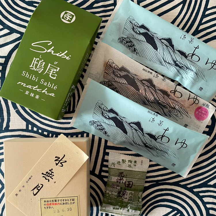 一緒に夏菓子「あゆ」と新発売の「鴟尾」(京抹茶)を買いました。「あゆ」は、スイカ果汁入りの珍しい物も有りました。