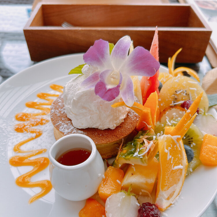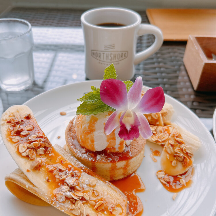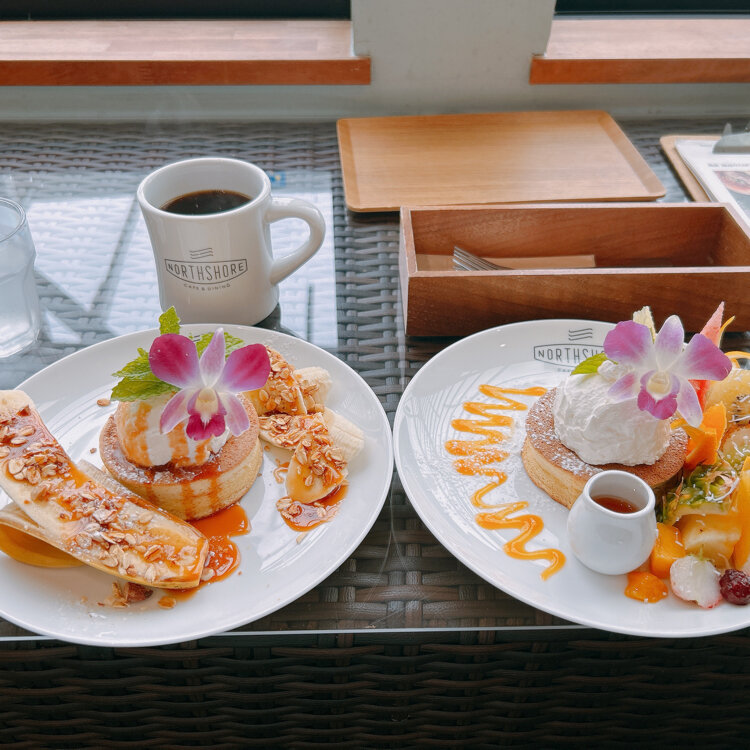 ノースショア再び〜🥰 雨がたくさん降るなか、朝ゆっくりしようとお出かけ🚗 パンケーキ食べて来ました🥞 バナナナッツキャラメル🥜🍌とトロピカルパンケーキ🍉🍍美味しかった〜😚 パンケーキ1枚とその上にたっぷりな生クリーム😍 朝からるんるんでした☀️