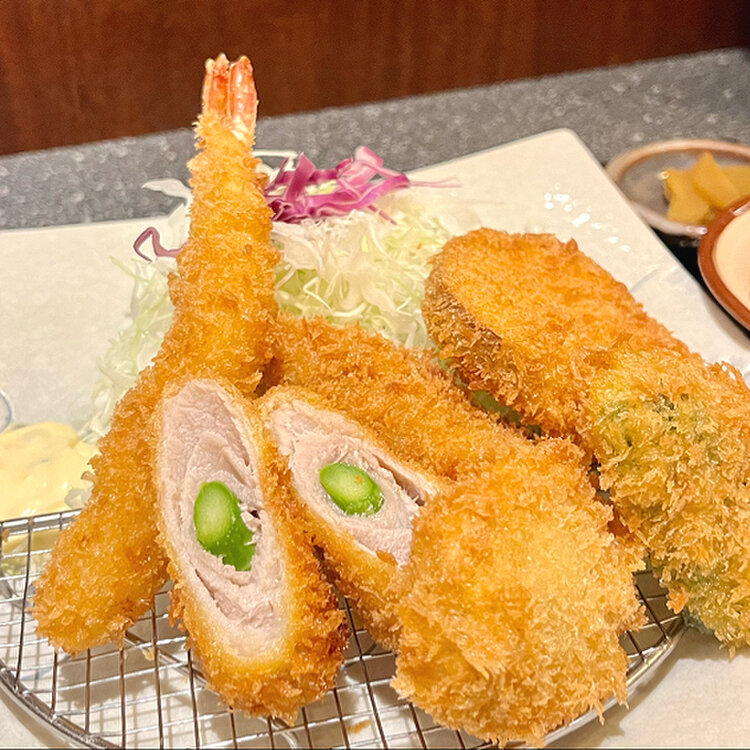 レディース膳を頂きました。エビフライやヒレカツなどバラエティに富んでます。珍しかったのがさつまいものカツ😳