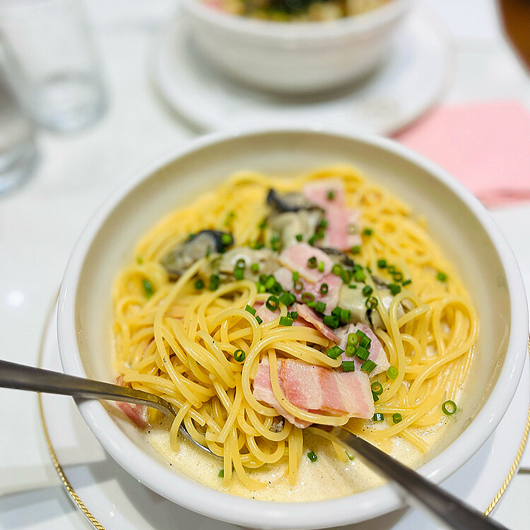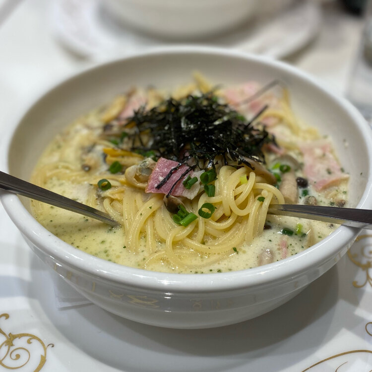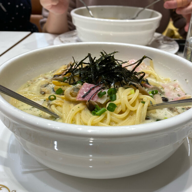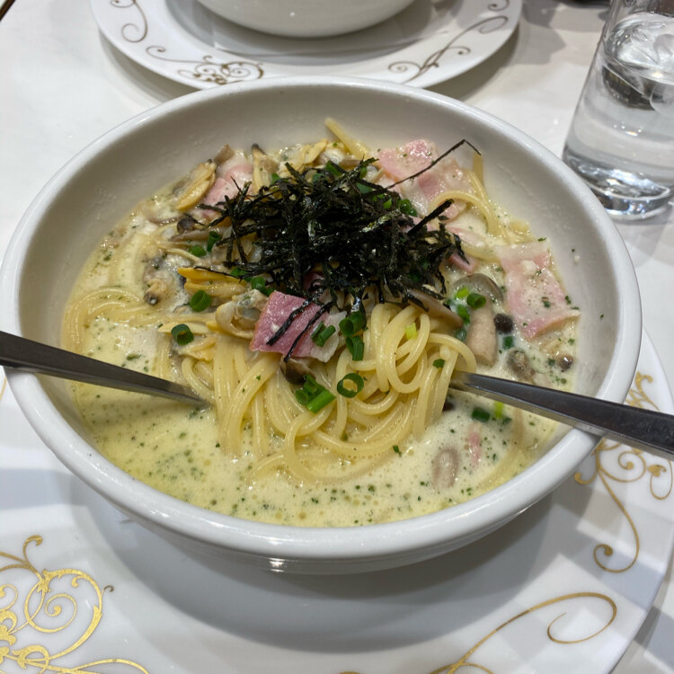 注文した料理は特製スープスパゲティで、あさり、しめじ、ベーコン、あさつき、海苔のスープスパゲティです。