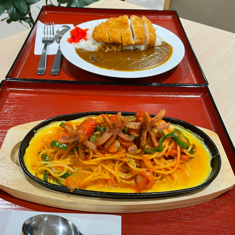 私はタコさんウインナーがのったナポリタン、主人はオムライスと迷ってポークカツカレー。