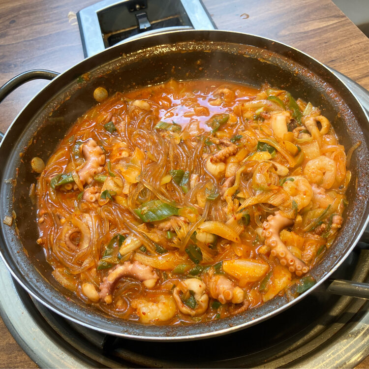 到着後、入国審査を経て預入荷物を受け取るのに1時間掛かったが、ソウル駅行きの特急は発車間際で乗れなかったため、次の便を40分待つより各駅列車に乗ることにした。そうこうして市庁駅のホテルに着くと13時過ぎていたが、周辺に飲食店が多く地元の人で賑わっている。肉を食べられない母の嗜好を優先して、釜山式ナクチポックンを食べることにした。タコとエビがメインで野菜と春雨を入れて煮込んだ真っ赤な鍋だが、見た目ほど辛くはなく、海苔とナムルを載せたご飯にかけてビビンバのようにかき混ぜていただく。タコとエビの量が多く、野菜もたくさん摂れてひとり10,000ウォンだった。店主は煮込み具合や食べ方を親切に教えてくれたし、出足からいい店に当たった。