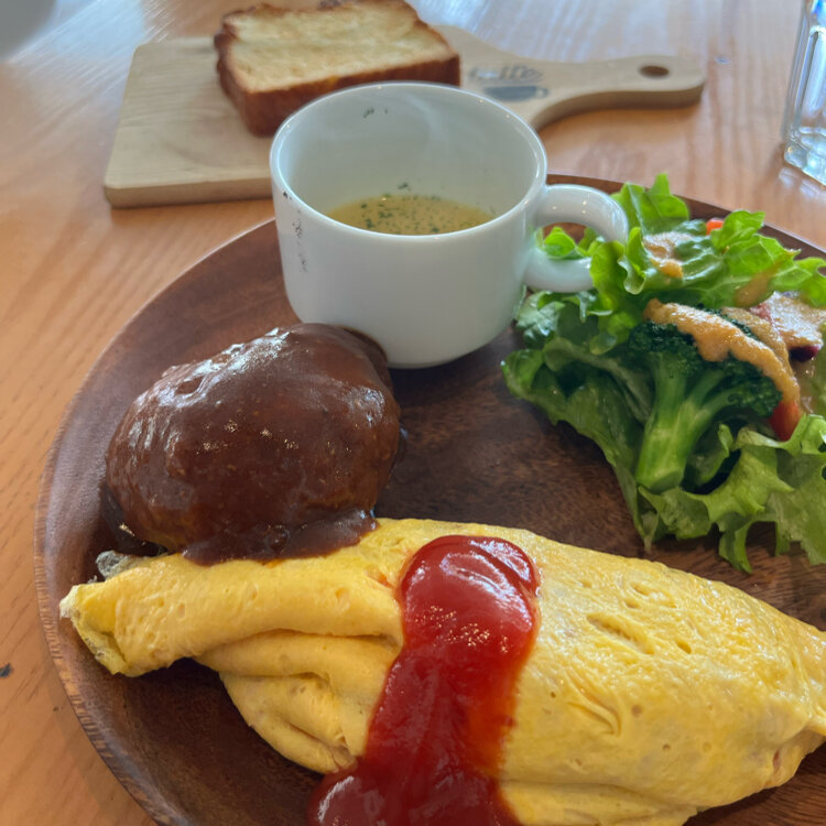 【latte】世田谷代田駅、下北沢駅付近のカフェ☕️ ランチメニューの「latte特製オムライスプレート」を注文しました。 レトロな洋食屋さんのような味で、特にサラダのドレッシングがおいしかった!少しニンニク風味?🧄 奥に写っているデニッシュも本当においしかったです。メープルシロップをかけたい…! ひとりでも複数人でも入りやすかったです。