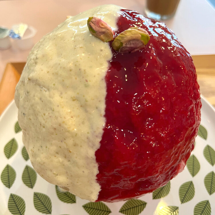 半分ずつかかっていて、中にもピスタチオクリームが入っていて、食べ進めていくとラズベリーとナッツが出てきました.