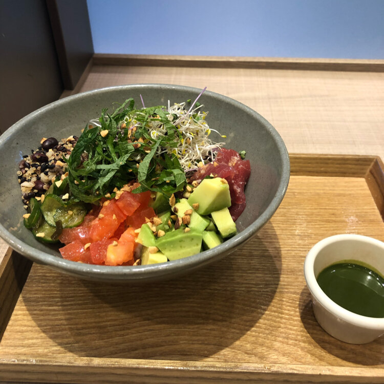 伊右衛門カフェ 塩麹漬けマグロとアボカドの丼 和風抹茶ダレをかけて食べます。 2枚目 抹茶ラテ🍵