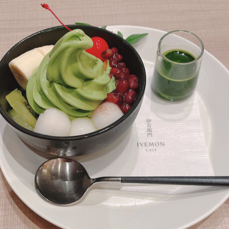 伊右衛門カフェ🍵 最近抹茶ブームです🥳 買い物だけでは終われず、寄り道してしまいました!笑 行きたいなと思ってたカフェだったので平日に寄れてよかったです✨ 他のメニューも美味しそうでしたが、ソフトクリームも食べれるあんみつにしました😊