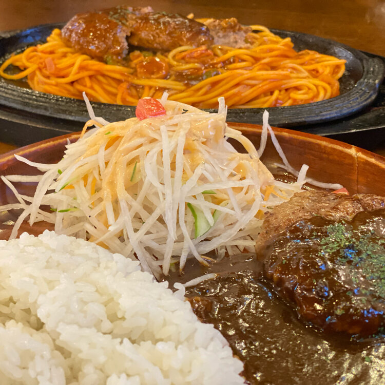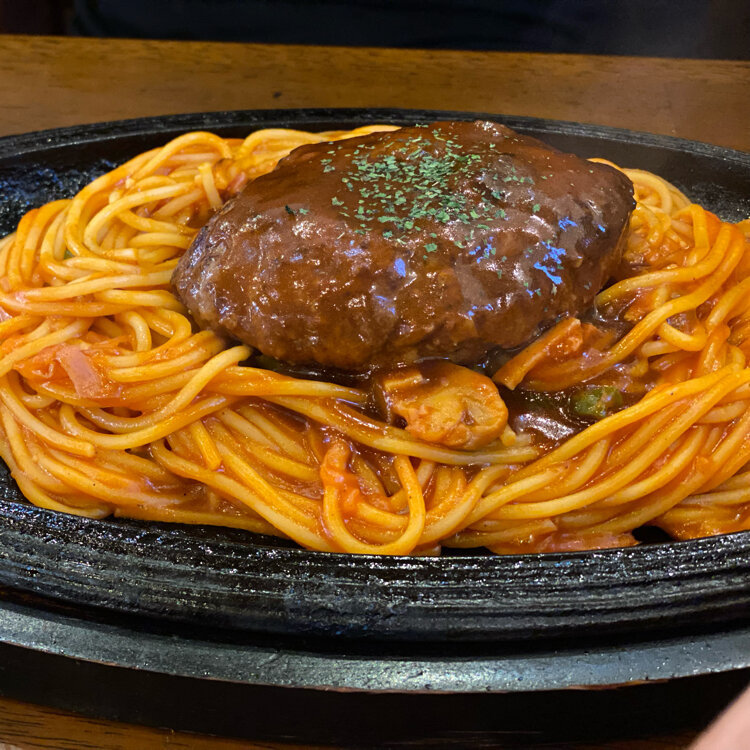 宮城県に遊びに行ったら帰りに必ず通る48号線 そこに前から気になっていた、 ハンバーグのお店ハングリーハングリー 今日は絶対そこに寄って帰ろうと決めていざ! お店に入るとほぼ満席でにぎやか☺️ 昔ながらの洋風レストランな店内 かろうじて空いていたテーブル席、良かった〜🥹 注文したのは1番人気のナポバーグ 熱々の鉄板にナポリタンとハンバーグ それとカレーハンバーグ ナポリタンは懐かしい味ですごく美味しい! カレーはスパイスが効いて濃くウマ! そしてハンバーグもジューシーでやわらかくて美味しい! これはすぐ満席になるな〜と納得です🧐 他のメニューも気になるし、 あと美味しそうなレトロなプリン🍮もありました また遊びに行った帰りに寄ろうと思います