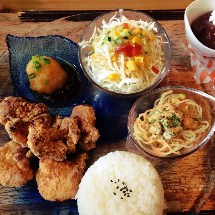 写真は唐揚げディッシュ?だったかな。唐揚げ、ご飯、小鉢、味噌汁、サラダ、デザート、ランチドリンクで980円くらいでした。