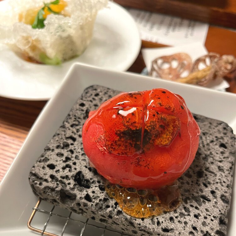 トマトの中にはチーズとエビや鳥などの具材が詰まっていて、石の上で焼けながらトロトロ~🧀