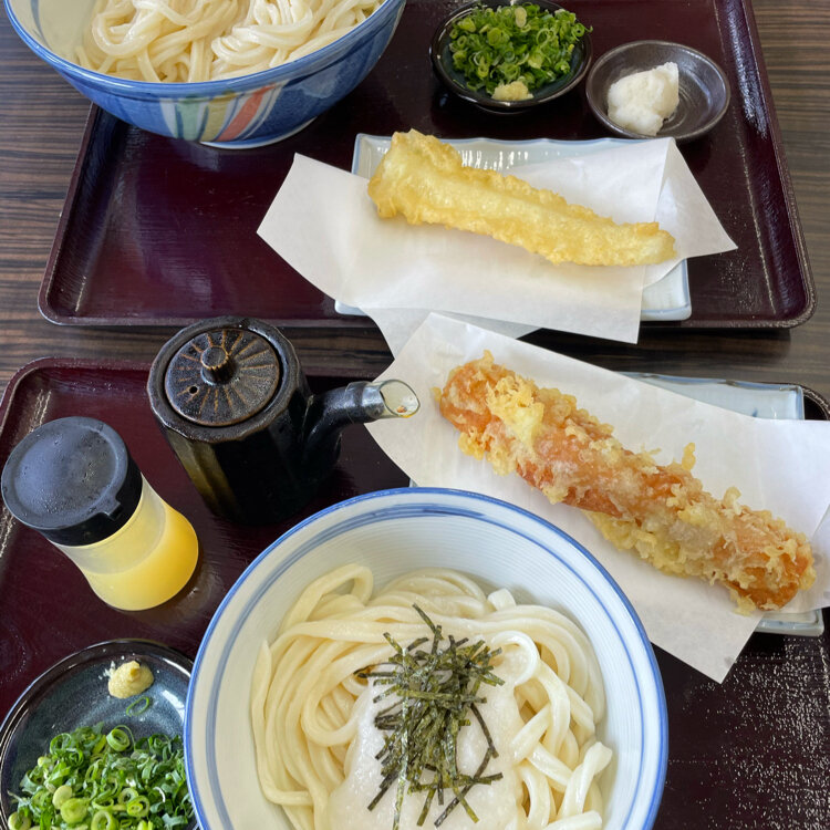 お墓参りを済ませて、お昼どきになったので、移動途中で目星をつけていたおうどん屋さんへ。