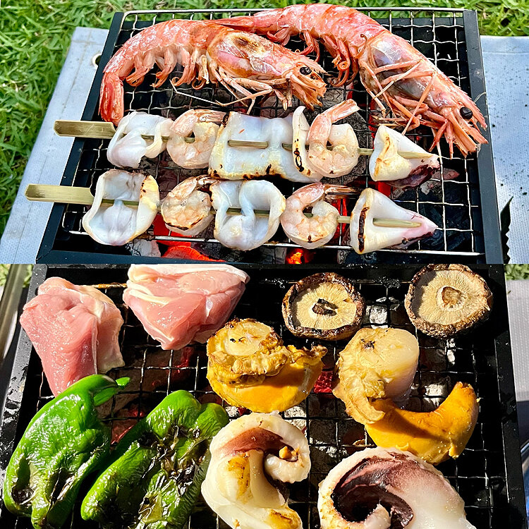 晩ごはんは海鮮メインのバーベキュー、朝ごはんは和定食。自然の中だとご飯が進みすぎて困ります💦